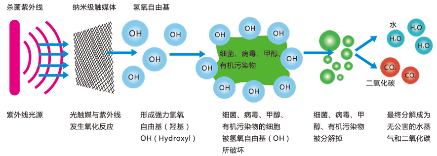光催化(光触媒)技术是一种利用新型的复合纳米高科技功能材料的氧化还原消毒技术。光催化剂氧化还原机理主要是催化剂受光照射,吸收光能,发生电子跃迁,生成电子-空穴对,对吸附于表面的污染物直接进行氧化还原,或氧化表面吸附的氢氧根,生成强氧化性的羟基自由基,将污染物氧化。因此光催化技术作为一种高效、安全的环境友好型环境净化技术,对室内空气质量的改善已得到国际学术界的认可。