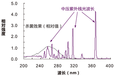 中压紫外线技术:广谱杀菌,中压灯能输出大量200~400nm的光,紫外线输出光谱广且强。经试验证明,365nm的光可以破坏修复酶,抑制光复活现象,全波段输出能达到更为彻底的杀菌作用。